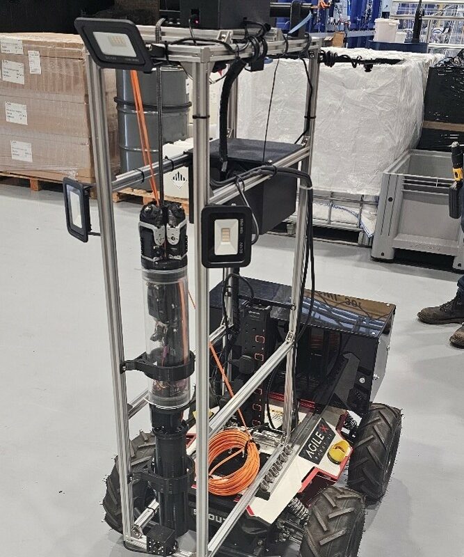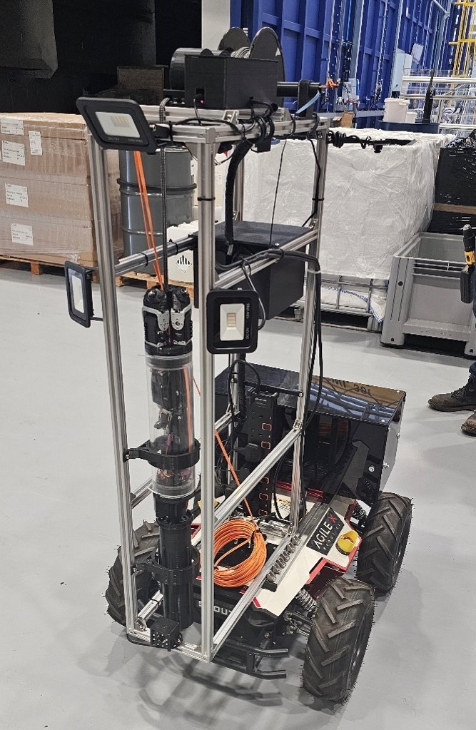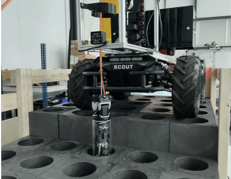 The robotic system was validated using active samples in a laboratory setting as well as with a non-active graphite mock-up. The University of Manchester’s Hot Robotics facility (RAICo1) provided the robotic platform—an AgileX Scout 2.0—onto which the system was mounted and integrated via a mesh network and custom software.